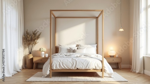 Serene Minimalist Bedroom with Canopy Bed and Soft Lighting