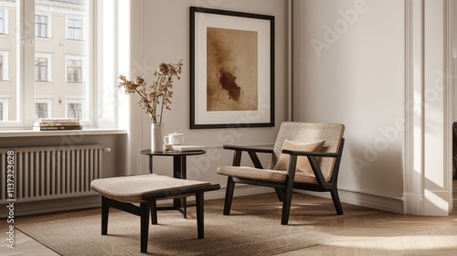 chair, room, interior, design, minimalist, modern, living, home, decor, furniture, cosy, comfortable, stylish, elegant, aesthetic, calm, serene, relaxing, peaceful, tranquil, sofa, ottoman, table, window, light, natural, beige, neutral, brown, black, wood, texture, art, picture, plant, flower, dried, floor, rug, apartment
