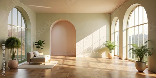 Serene Minimalist Living Room with Arch Windows and Sunlight