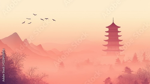 Serene Misty Landscape with Pagoda and Silhouetted Mountains