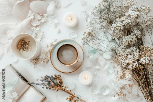 hot drink, dried flowers, candle, crystal, relaxation, serene, calmness, mindfulness, calming, home decor, tabletop, aesthetic, teacup, floral arrangement, wellness, meditation, peaceful, lifestyle, white background, gentle, soft, vintage, natural, simplicity, zen, cosy, elegant, earth-tone, aromatherapy, spa, harmony, chic, interior design, comfort, herbal tea, natural light