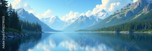 mountain, lake, sky, cloud, tree, forest, water, landscape, nature, peaceful, serene, scenery, blue, green, rock, shore, summer, tranquil, majestic, vale, alpine, wilderness, calm, sunlight, daylight, pine, scenic, vista, clear, beautiful, wide, remote, travel, adventure, dreamy, soft, snowy, peak, glacier, light
