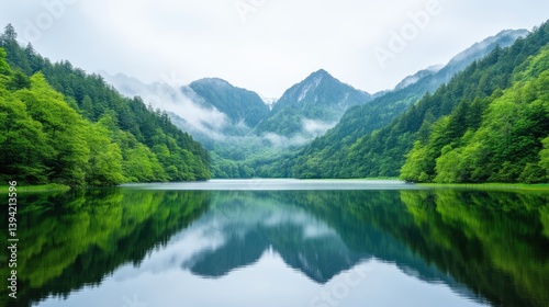 Serene mountain lake reflecting lush greenery. Misty peaks rise above tranquil waters