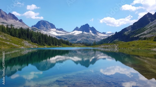 Serene Mountain Lake Reflection: A Breathtaking Panorama of Majestic Peaks and Tranquil Waters