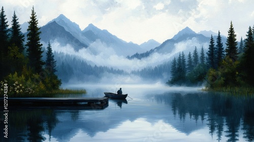 Serene Mountain Lake with Lone Boatman at Dawn