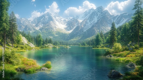 mountain, lake, tree, water, sky, cloud, nature, scenery, flora, fauna, calmness, wilderness, landscape, summer, sunlight, beauty, adventure, serenity, exploration, hiking, environment, ecosystem, biodiversity, peaceful, vibrant, colourful, wildlife, ripple, rock, grass, meadow, clear, fresh, picturesque, view, panoramic, majestic, natural, scenic, habitat, journey, relaxation, calm, remote, untouched, pristine, alpine