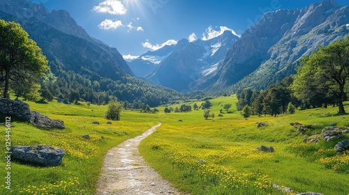 Serene mountain landscape with a winding path through vibrant meadows under a bright sky