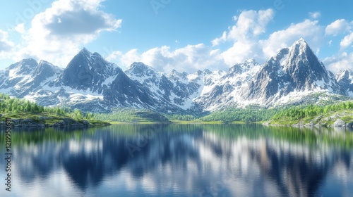 Serene mountain landscape with reflective lake.
