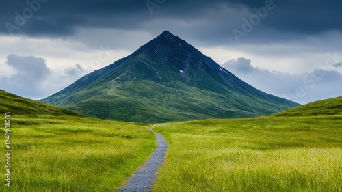 Serene Mountain Path Green Grassland Leading to Majestic Peak under Dramatic Sky