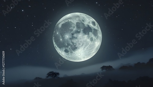 Serene Night Scene with a Radiant Moon and a Starry Sky Over Misty Land