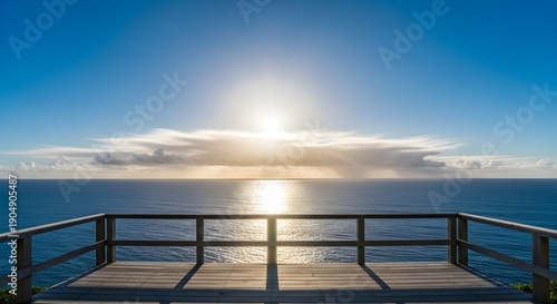 Serene ocean view from a wooden pier with a bright sun shining down on a calm blue sea, creating a peaceful atmosphere during sunrise.
