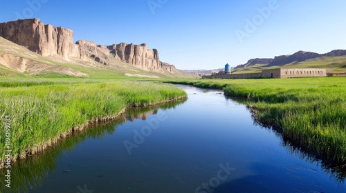 river, landscape, vale, ruin, historical site, ancient, archaeology, nature, travel, destination, outdoors, scenic, view, summer, daytime, sunny, bright, calm, peaceful, serene, tranquil, water, vegetation, green, grass, plant, rock, stone, mountain, hill, horizon, sky, blue skies, clear sky, still water, photo, photo, image, picture, hi-res, royalty free, licence, download, print