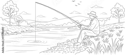 Serene riverside fishing scene with man on grassy bank, black and white line art vector for nature, leisure, and outdoor concept.