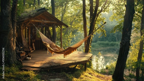 Serene Rustic Shelter with Wooden Deck and Hammock Surrounded by Lush Green Forest and Tranquil Waters in Golden Morning Light