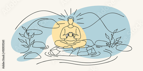 serene, sip, figure, sit, smooth, rock, holding, steaming, cup, herbal, tea, sunlight, water, surface, small, ripple, dance, stone, stream, burnout, detox, stress, relief, mental, health, wellness, retreat, relaxation, balance, recharge, nature, get-away, offline, escape