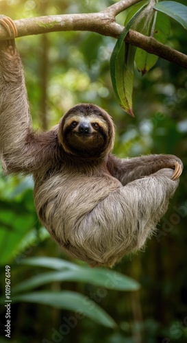 Serene Sloth Hanging from a Lush Green Tree Branch in Tropical Forest