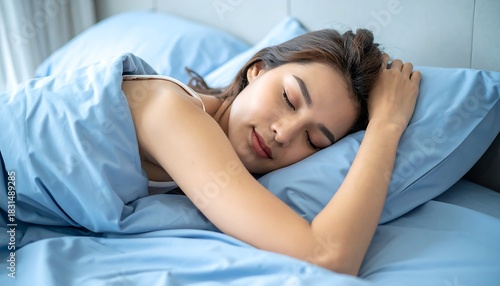 sleep, woman, bed, bedchamber, sleeping, rest, relax, comfortable, duvet, pillow, morning, night, dream, peaceful, young, health, wellness, lifestyle, home, cosy, blanket, linen, serene, calm, face, eye, hair, skin, beauty, nap, to rest, latently, quiet, tranquil, recovery, rejuvenation, refresh, restful, slumber, doze, snooze, unconscious, horizontal, prone, supine, dormancy, inactivity, stillness