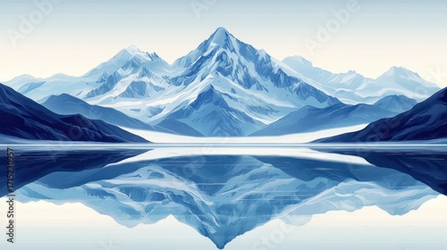 Serene snow-covered mountain range reflected perfectly in calm lake water under clear sky