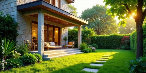 house, home, residence, real estate, property, architecture, building, exterior, landscaping, garden, lawn, grass, tree, shrub, plant, flower, patio, porch, deck, stone, sunlight, golden hour, peaceful, tranquil