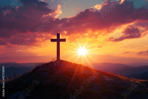Serene Sunrise Behind Cross on Hill, Spiritual Awakening Concept , ai