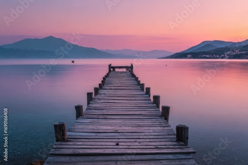 sunrise, lake, pier, wooden, calm, tranquil, water, mountain, pink, sky, horizon, misty, gentle, calmness, beauty, nature, outdoors, peaceful, still, colours, gradient, vibrant, pastel, morning, dusk, cloud, long, perspective, landscape, scenic, view, travel, vacation, relaxing, adventure, serenity, inspiration, photo, image, romantic
