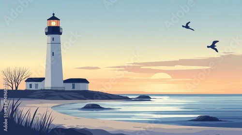 lighthouse, sunset, coast, water, bird, serene, scenic, tranquil, ocean, sky, nature, evening, landscape, vintage, illustration, calm, beach, rock, horizon, silhouette, marin, wildlife, outdoors, idylli, peaceful, scenery, blue, orange, gradient, graphic, art, digital, sunrise, dawn, shoreline, cloud, reflections, vacation, retreat, coastal, scenic view, picturesque, relaxation, landmark