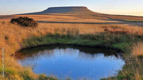 pool, water, landscape, nature, sunset, grass, sky, hill, mountain, horizon, calm, serenity, peace, calmness, stillness, gold, light, yellow, blue, green, brown, scenic, view, rural, countryside, field, meadow, vegetation, summer, evening, day, beautiful, amazing, marvellously, photo, image, picture, photo