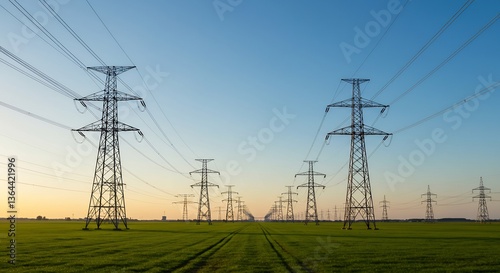 electricity, power, energy, transmission, line, tower, pylon, grid, infrastructure, network, wire, cable, high voltage, electricity pylon, powerline, electrical, high tension, steel, metal, structure, support, landscape, field, meadow, grass, green, sky, horizon, clear, bright, sunlight, dawn, dusk, sunshine, rural, countryside, nature, environment, industrial, technology, utility, system, distribution, power generation, renewable