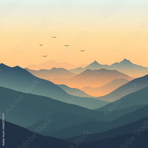 sunset, mountain, landscape, peak, range, blue, orange, sky, horizon, serene, calm, peaceful, tranquil, nature, scenic, view, vista, bird, flying, silhouette, layer, hill, vale, dawn, evening, golden hour, mountain chain, beautiful, majestic, awesome, breathtaking, amazing, art, illustration, graphic, design, background, wallpaper, poster, print, minimal, abstract