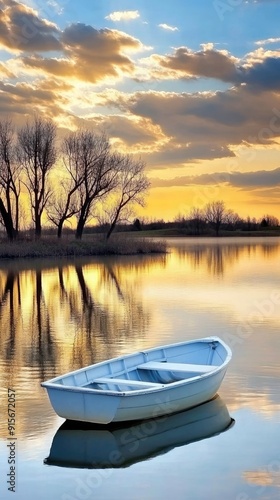 Serene sunset over a calm lake with a solitary rowboat reflection