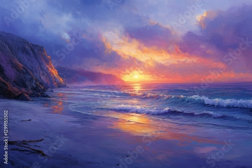 sunset, beach, ocean, wave, sea, cliff, coast, sky, cloud, landscape, nature, scenic, tranquil, serene, peaceful, calm, beautiful, vibrant, colourful, golden hour, twilight, evening, picturesque, romantic, artwork, painting, art, coastal, shoreline, horizon, bird, solitude, majestic, breathtaking, inspiring, dreamy, magical