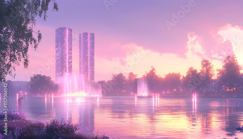 lake, sunset, city, building, architecture, modern, tower, fountain, water, pink, purple, pastel, calm, serene, peaceful, tranquil, evening, twilight, light, glow, futuristic, fantasy, dreamlike, romantic, aesthetic, illustration, digital artwork, background, wallpaper, design, artwork, scene, view, landscape, nature, urban, contemporary, vibrant, soft, beautiful, magical