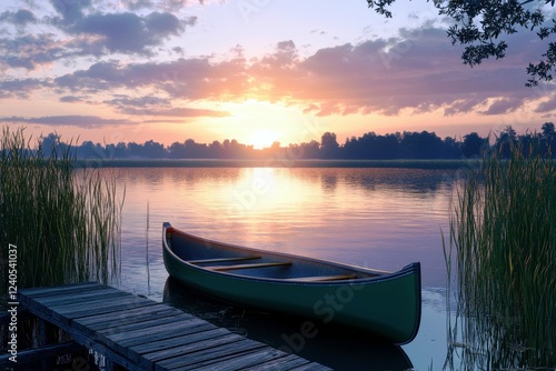 lake, sunset, canoe, dock, water, nature, landscape, serene, peaceful, greenery, travel, scenic, tranquil, vacation, sky, cloud, wooden, shore, ripple, adventure, explore, bright, vibrant, evening, calm, summer, picturesque, beauty, wilderness, forest, retreat, horizon, sunlight, warm, environment, solitude, relaxation, paddle, leisure, blue, orange, lush, scenic view, ecosystem, countryside, flora, fauna