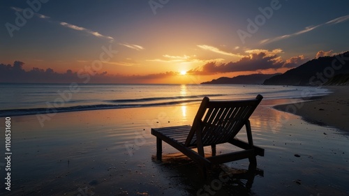sunset, beach, ocean, sea, sky, cloud, sun, horizon, water, sand, calm, tranquil, peaceful, serene, relaxing, summer, evening, twilight, gold, orange, yellow, blue, nature, landscape, scenic, view, travel, vacation, holiday, paradise, escape, solitude, rest, relaxation, peace, quiet, stillness, silhouette, chair, lounge, wooden, empty