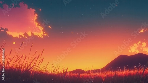 sunset, sunrise, field, grass, plant, landscape, mountain, hill, sky, cloud, orange, red, warm, colours, nature, scenic, tranquil, peaceful, serene, calm, beautiful, picturesque, vibrant, stunning, majestic, idylli, dreamy, romantic, evening, dusk, dawn, light, golden hour, horizon, silhouette, background, wallpaper, art, illustration, design, digital artwork, fantasy