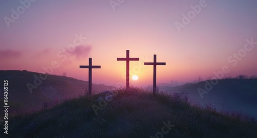 Serene Sunset Over Three Crosses in a Tranquil Landscape Evoking Themes of Faith, Hope, and Reflection During a Peaceful Evening Moment