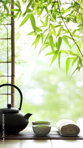 Serene Tea Time: A tranquil arrangement of a traditional teapot and teacups against the backdrop of fresh green bamboo leaves offers a moment of calm and reflection.