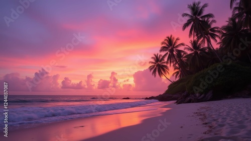 beach, sunset, tropical, sky, colours, cloud, ocean, wave, palm, tree, nature, coastline, relaxation, vacation, scenic, landscape, horizon, calmness, evening, summer, shore, peaceful, dreamlike, travel, beauty, paradise, seascape, sunlight, sand, dusk, idylli, warm, summer, vibrant, serene, natural, atmospheric, water, marin, environment