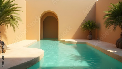 pool, oasis, water, architecture, tropical, plant, arch, doorway, design, relaxation, summer, building, luxury, serene, calm, minimalist, style, paradise, leisure, vacation, destination, travel, tour tourism, exterior, structure, background, poolside, resort, recreation, villa, residence, modern, home, courtyard, nobody, sunny, daylight, beige, shadow, geometric, symmetry, perspective, escape, retreat, elegant, dream