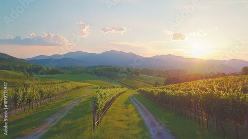 Serene vineyard landscape at sunset with rolling hills and mountains.