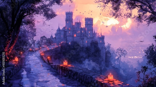 castle, dusk, watercolor, illustration, landscape, architecture, fantasy, nature, art, evening, calmness, light, shadow, pathway, tree, sky, cloud, atmosphere, magical, autumn, colours, serene, peaceful, mediaeval, hill, lantern, mystical, scenery, beauty, heritage, history, travel, artistic, creative, dreamy, twilight, whimsical, dark, bright