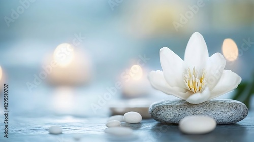 Serene White Lotus Flower on Stones with Gentle Candlelight : Generative AI