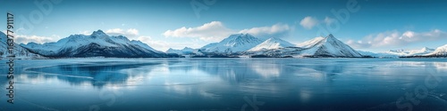 Serene Winter Landscape with Snow-Capped Mountains and Crystal Clear Lake Reflecting Blue Sky