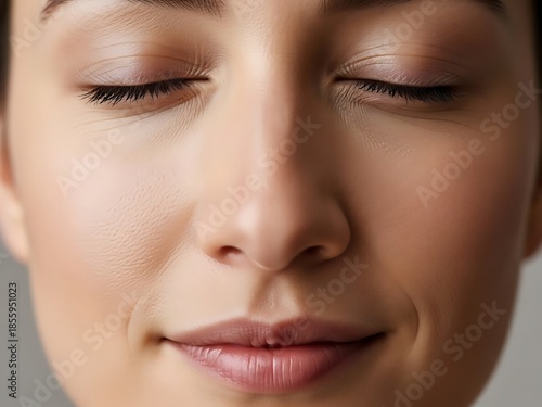 Serene Woman s Face with Closed Eyes Gentle Smile Portrait Detail Calm Expression Natural Beauty Skin Texture Focus
