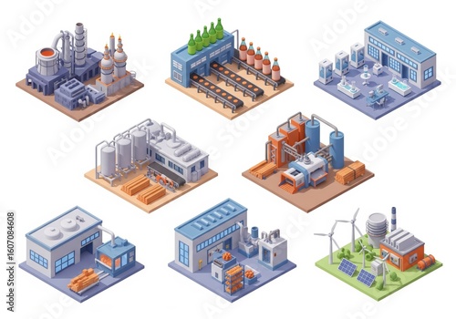 isometric, three-dimensional, factory, industrial, illustration, set, collection, series, production, manufacturing, plant, facility, steel, mill, metal, blast, furnace, beverage, bottling, drink, pharmaceutical, medicine, drug, wood, timber, timbering, processing, plastic, polymer, energy, power, generation, white, background, clean, line, design, drawing, perspective, technical, consistent, modern, vector, graphic, diagram