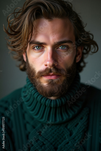man, beard, portrait, green, sweater, serious, thoughtful, masculine, expression, model, haircut, look, sharp, male, clean, intense, texture, wool, fashion, stylish, natural, studio, eye, strong, face, sharpened, modern, identity, pose, lighting, elegant, attractive, direct, confidence
