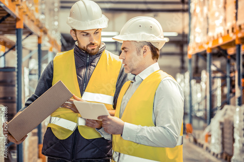 communication, business, partner, quality, control, modern, technology, warehouse, workplace, storing, facial, expression, equipment, technology, ceo, contraption, director, protection, helmet, employment, package, employee, manager, leisure, interaction, tied-up, people, caucasian, emotional, direction, men at work, uniform, man, box, job, pleasure, work, male, young, storage, delight, partner, career, waist up