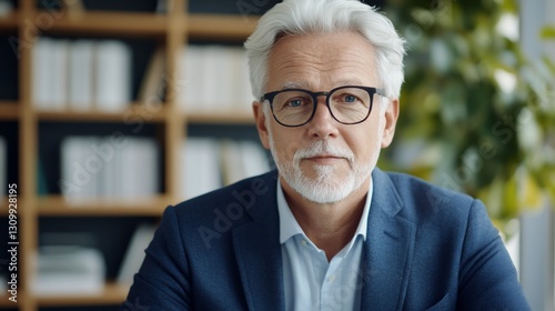 business, professional, portrait, serious, goggles, grey hair, leader, expert, corporate, office, library, bookshelf, confident, intelligent, life events, marketing, website, leadership, management, executive, navy blue, closeup