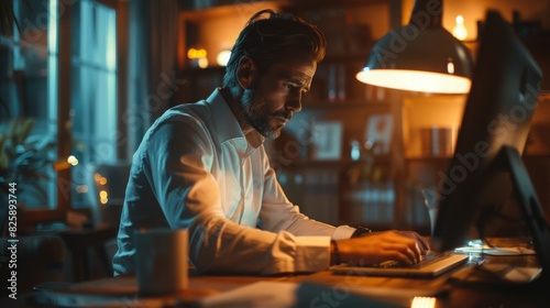 office, men at work, professional, business, attire, desk, working, bright, environment, natural, daylight, closeup, upper, body, face, serious, concentration, indoor, career, employment, job, productivity, workstation, computer, keyboard, monitor, document, paper, pen, cubicle, modern, technology, lamp, window, shadow, professionalism, suit, attaching, shirt, goggles, sharpened, determination, success, background