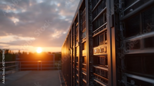 server, rack, sunset, technology, infrastructure, datum, hardware, computing, network, datacenter, storage, digital, electronic, equipment, system, computer, information, information technology, modern, industry, business, sky, cloud, light, warm, orange, yellow, glow, illumination, engineering, power, energy, connected, innovation, future, communication, security, cloud, architecture, metallic, metal, grid, panel, illuminated, dusk, cable, wire